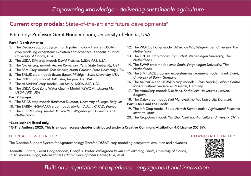 The book also includes an updated chapter written by Boote et al. on the DSSAT Cropping System Model. This chapter is freely available under a CC BY license and can be obtained from the following link: Click here to download book chapter.